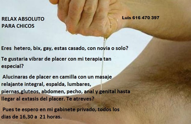 MASAJE SENSITIVO GENITAL PARA HOMBRES HETEROS BIX o GAYS Si tienes curiosidad o morbo en este tipo de masajes. Eres hetero, curioso, bix, gay o sientes curiosidad y te gustaría probarlo, te ofrezco masaje relajante - sensitivo en el que además de relajar el cuerpo se masajean zonas cómo glúteos/ perineo -anal/genital por un precio de 35 euros .Gabinete propio y discreto. Solo tienes que llamarme y concertamos una cita. Si quieres vibrar de placer. . , llámame. Masaje realizado en camilla con aceites naturales, sin olor. Luis: 616 470 397.