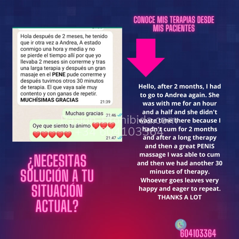 SOY ANNA SEXOLOGA LOS TERAPIAS SON REALES, VAN DIRIGIDAS A LA SANACIÓN DEL CUERPO FÍSICAMENTE DOLORIDO DOLENCIAS Y ESTADOS ANÍMICOS Y PSICOLÓGICOS MOTIVADOS POR LA ANGUSTIA QUE PRODUCEN CIERTAS VIVENCIAS EN EL CAMPO DE LA RELACIÓN INTERPERSONAL CON LA PAREJA, EXPERIENCIAS QUE PRODUCEN VERGÜENZA, HUMILLACIÓN, FRUSTRACIÓN Y QUE REPERCUTEN EN NUESTRA VIDA TANTO A NIVEL FÍSICO COMO PSICOLÓGICO SE ADVIERTE QUE ESTAS TERAPIAS SOLO VAN DESTINADAS A CURAR Y SANAR... SI NECESITAS AYUDA DE VERDAD LLAMA!!